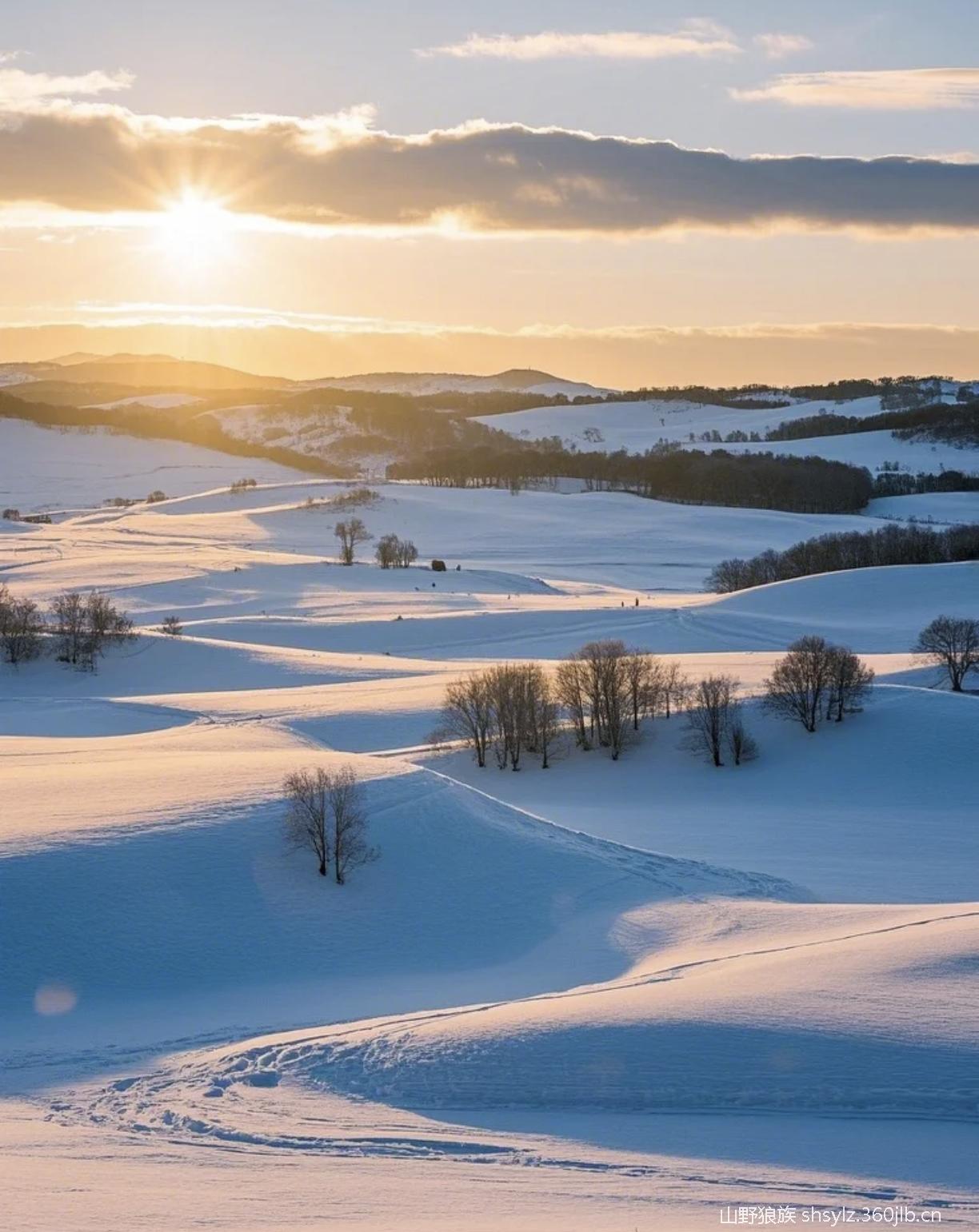 随着夕阳西下,我们驱车来到【鹰窝沟】看日落,这里有雪丘之上的排排白桦林,在阳光照射下白桦树干与白雪争辉,长长的树影拖在雪丘之下层次分明,温柔铺展一幅绝美画卷。
